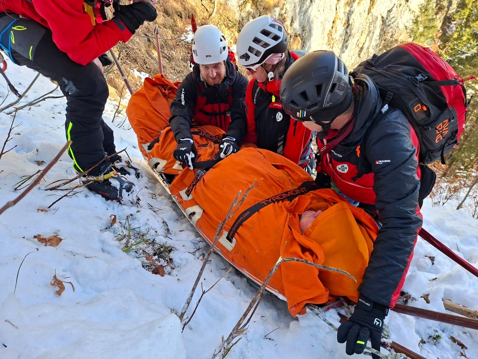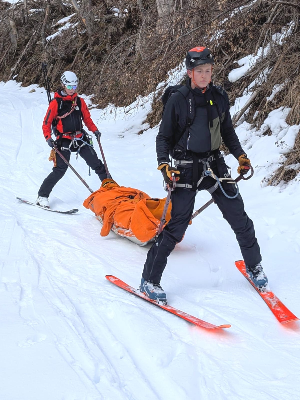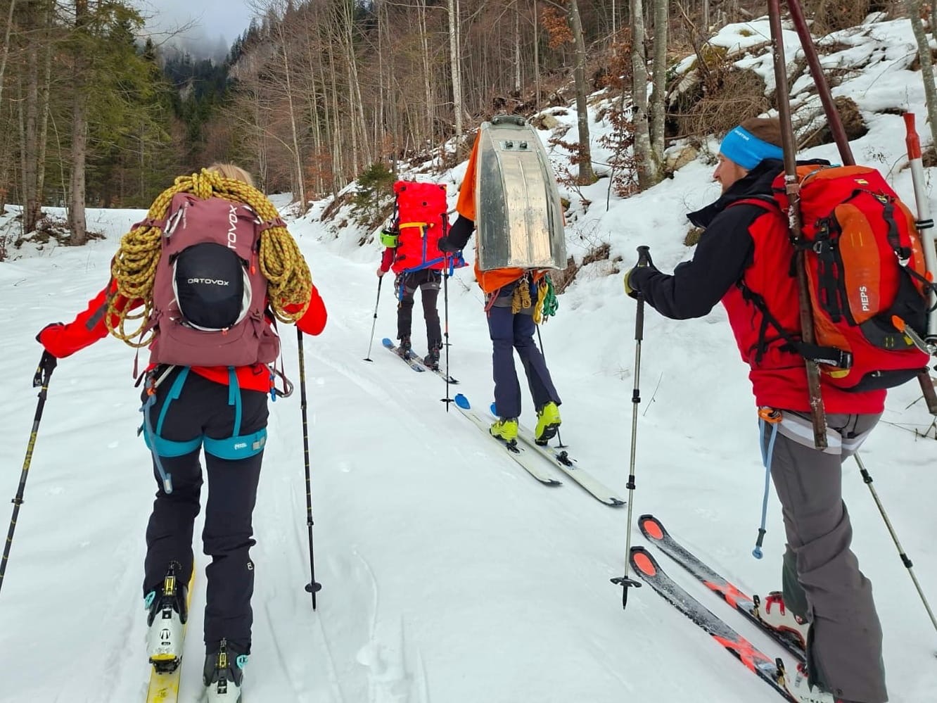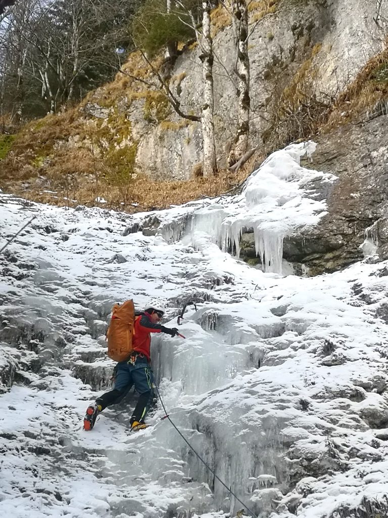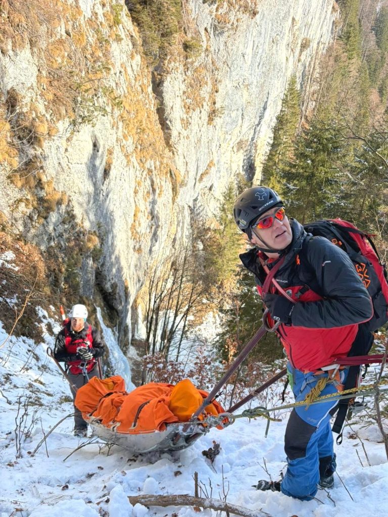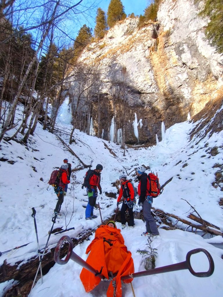 12 Kameradinnen und Kameraden unserer Ortsstelle übten heute die Bergung einverletzten Person aus einer vereisten Steilrinne. Mit den Skiern und später mit Steigeisen mussten wir circa 45 Minuten zu einer vereisten Steilstufe zusteigen. Die circa 10m hohe Eiswand wurde von einem Vorsteiger überwunden, die restliche Mannschaft konnte am Fixseil mit dem Material (Seile, Akja,…) weiter aufsteigen. Anschließend seilten wir die verletzte Person im Akja in den Grabengrund, teilweise durch dichten Wald und über das Bachbett, bis zum Skidepot ab. Von da ging es weiter mit den Skiern bis zum Auto.